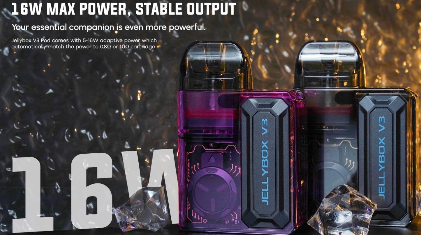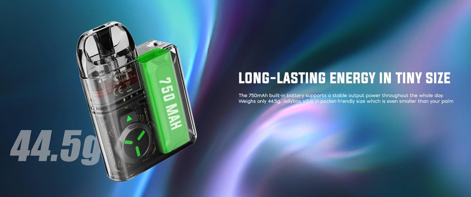 Jellybox V3 Kit features stunning and half transparent appearance with futuristic design. It is powered by a built-in 750mAh battery with Type-C charging to bring you all day vaping experience. It also comes with 5-16W adaptive power which automatically match the power to 0.8Ω/1.0Ω Cartridge. Designed with upgraded NCU chip, it provide a constant output voltage to ensure delightful MTL experience.